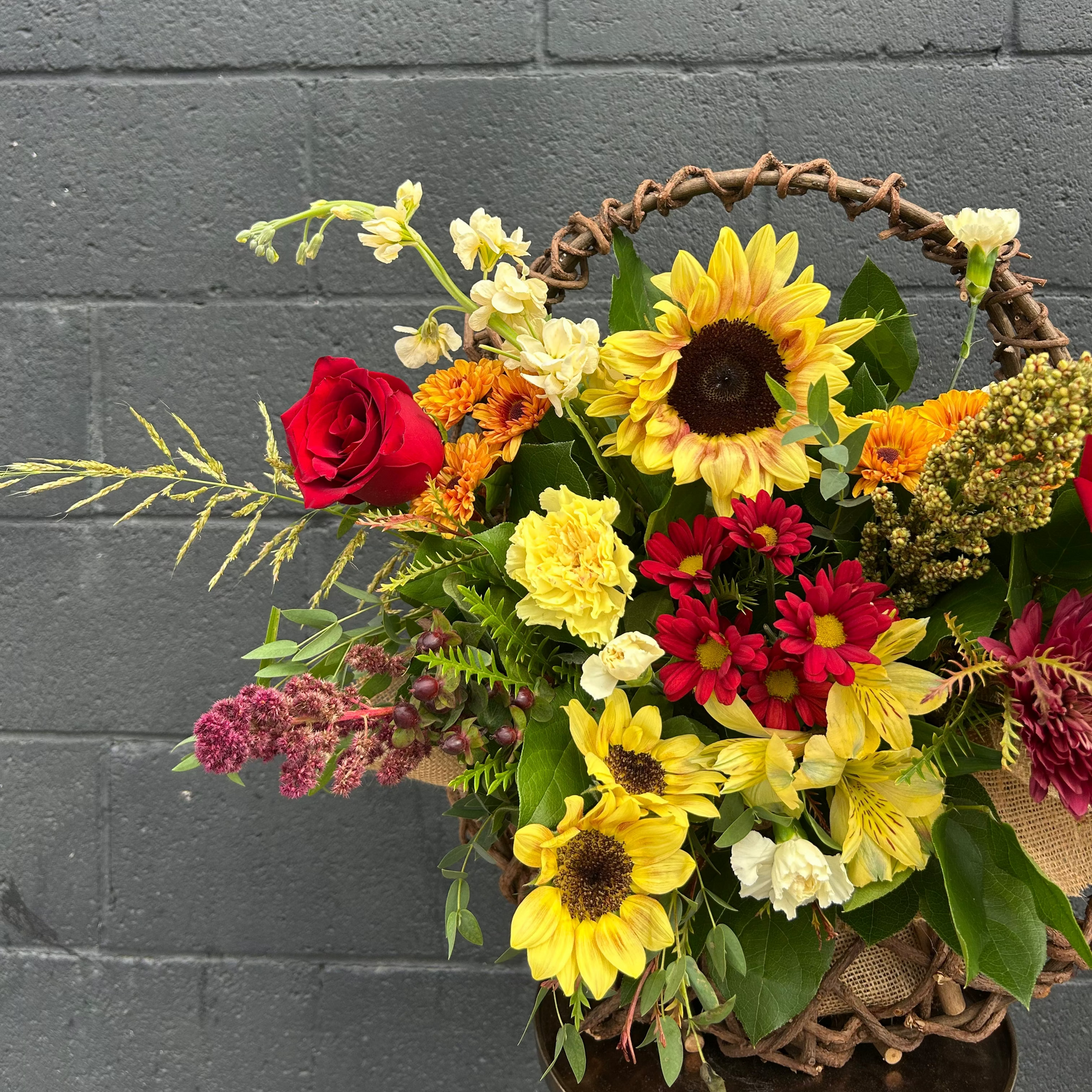 Something you are sure to πfallπ in love with. Arranged in a vine wrapped basket are lovely fall blooms ranging from red, yellow, orange and burgundy flowers that can vary from week to week. Bring that fall joy into your home or gift it to someone you love this season!