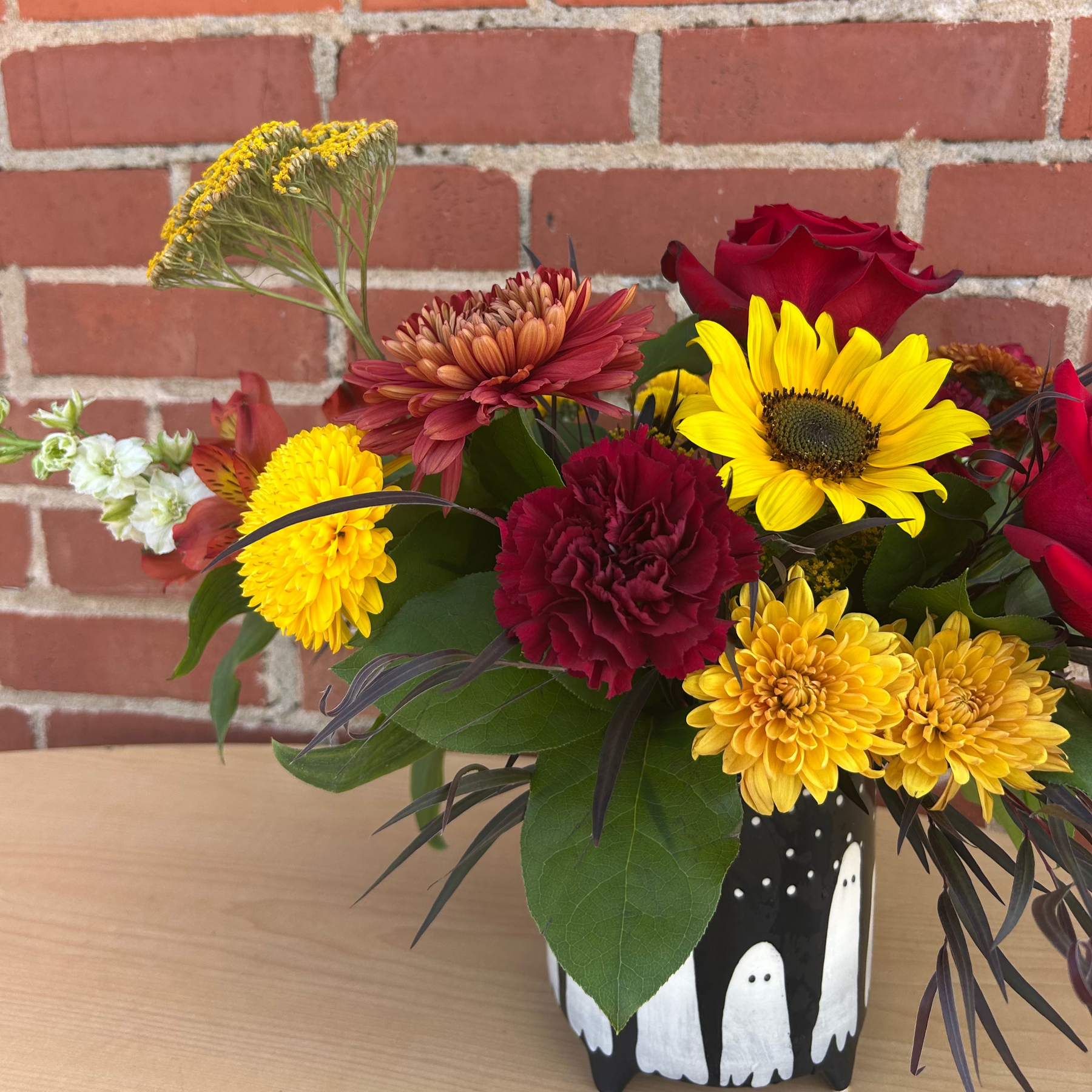No tricks, just treats this Hallows' Eve. This arrangement is blooming with lovely fall florals ranging from red, yellow, orange and burgundy flowers that can vary from week to week. Bring that fall joy into your home or gift it to someone you love this season!