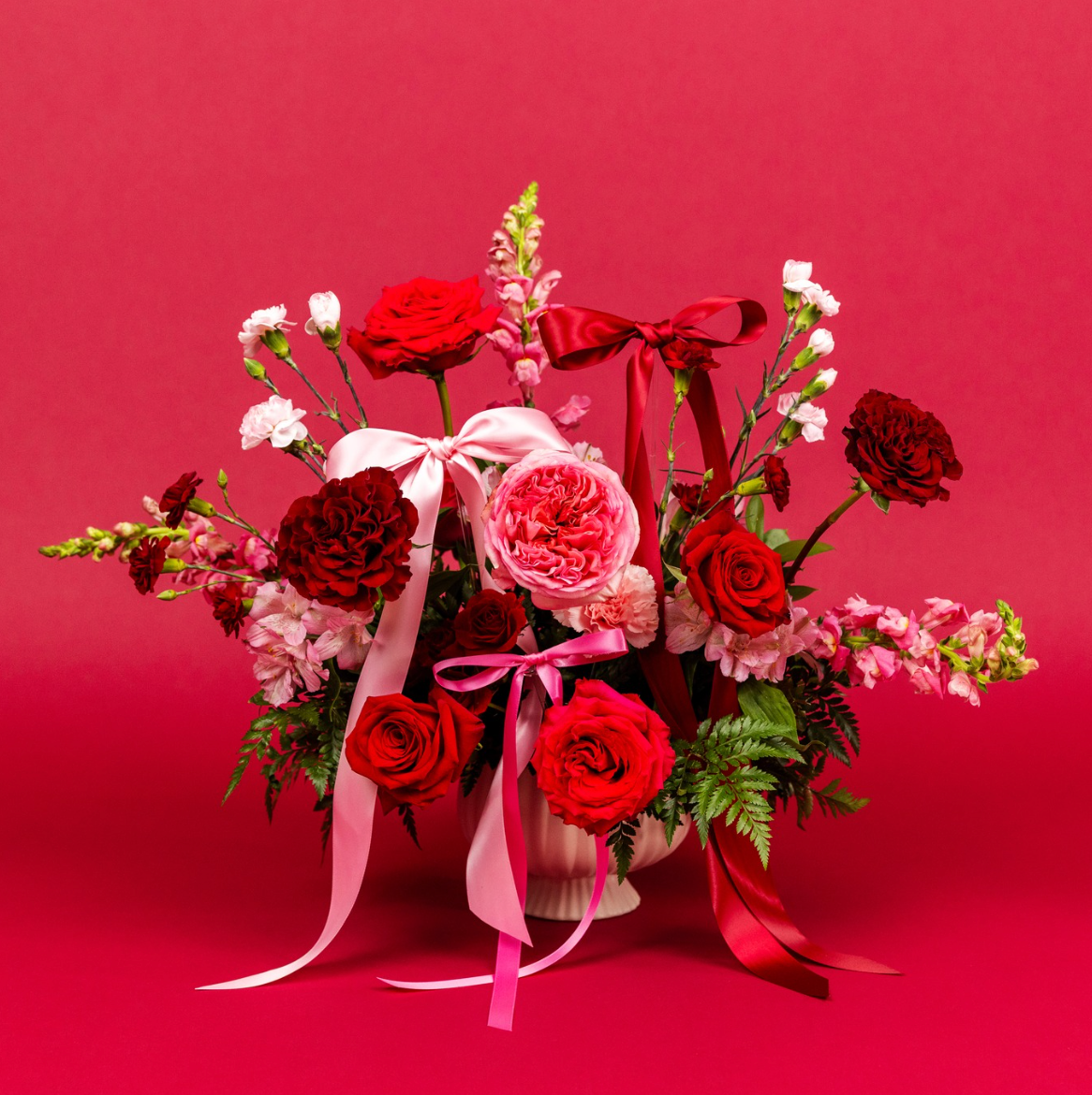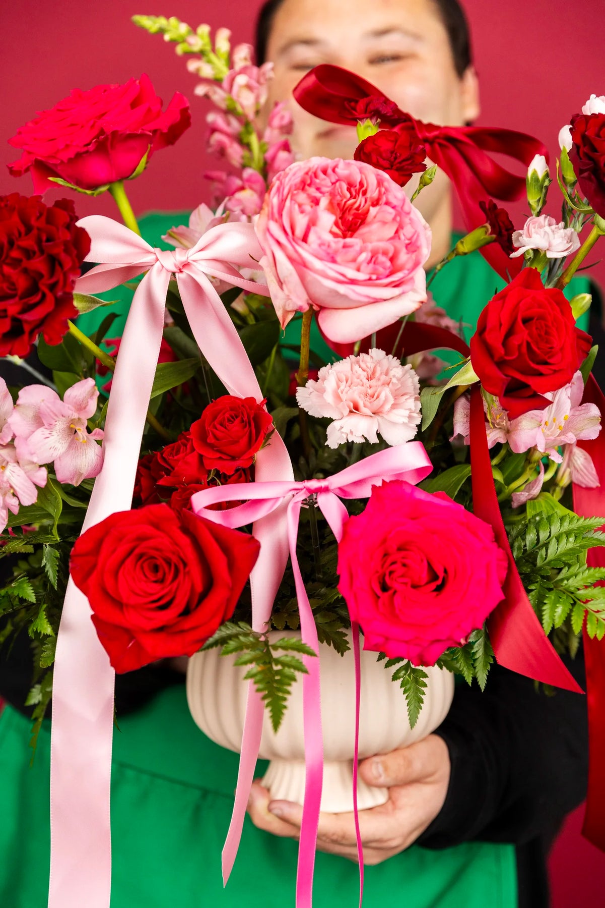 Our extra-large arrangement is a confident declaration of love. It proudly says: “You’re the very best in the Wild West!” 🫶 A lush collection of pink and red florals, this gorgeous bouquet comes arranged in a pink compote vase as photographed. And three satin bows add extra charm to this love letter made of flowers. 💌
